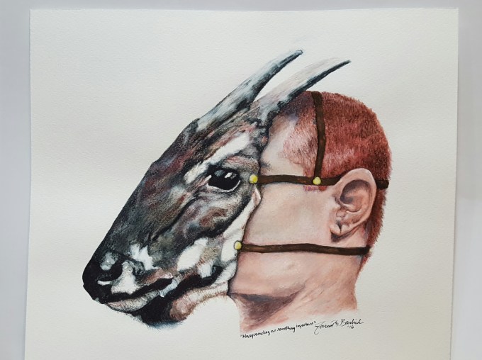 “Masquerading as something important” – Watercolor pencil on paper / 9.5″ x 10″ / Framed / $650