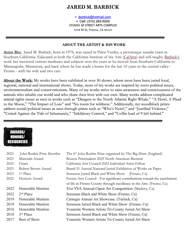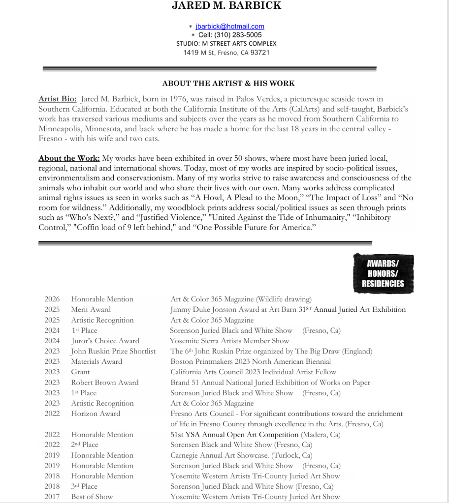 Artist Bio: Jared M. Barbick, born in 1976, was raised in Palos Verdes, a picturesque seaside town in Southern California. Educated at both the California Institute of the Arts (CalArts) and self-taught, Barbick’s work has transversed various mediums and subjects over the years as he moved from Southern California to Minneapolis, Minnesota, and back where he has made a home for the last 10 years in the central valley – Fresno – with his wife and two cats.
