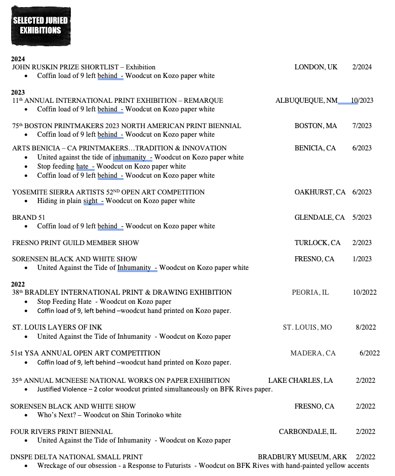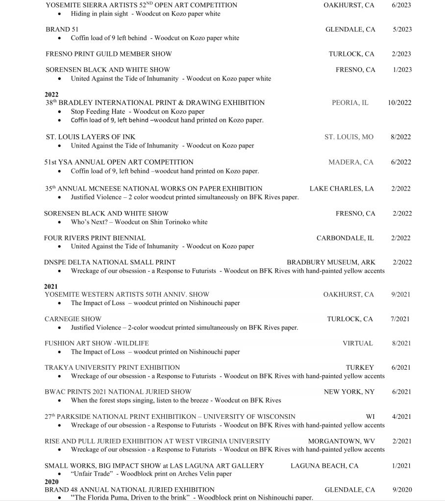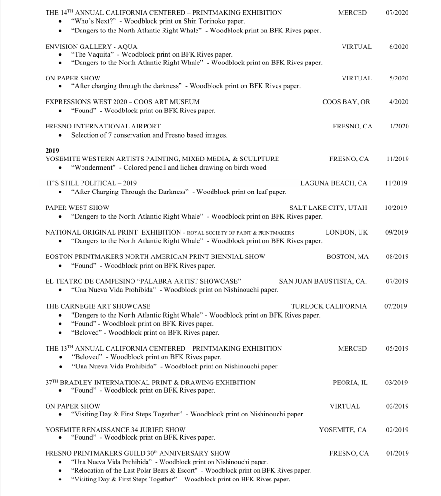 About The Work: Today, most of the artist’s works are inspired by environmentalism and conservationism as well as social issue awareness. The works strive to raise awareness and consciousness around the animals who inhabit our world and who share their lives with our own. He is known for creating captivating images that draw the audience in through the remarkable work with animal expressions as illustrated in the work “The Fire” and “Wonderment”. Most recently, his woodblock prints have addressed social/political issues through prints such as “Molding Monsters,” “Morning Commute,” and “Una Nueva Vida Prohibida,” as well as addressing complicated animal rights issues as seen in “Dangers to the North Atlantic Right Whale” and “Unfair Trade”.